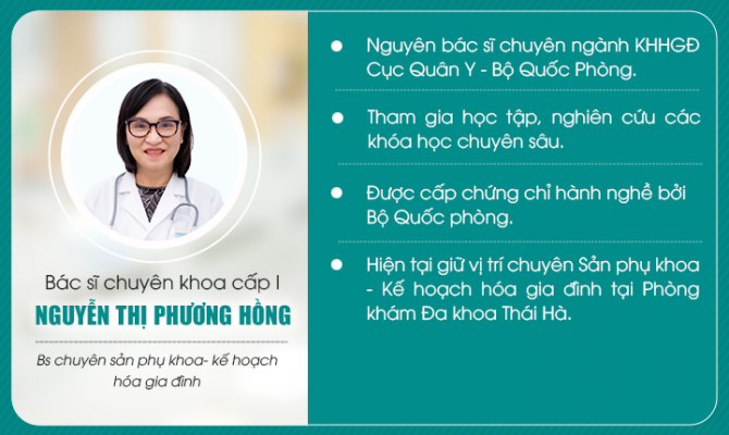 Từng là bác sĩ chuyên ngành Kế hoạch hóa gia đình tại Cục Quân Y - Bộ Quốc phòng, bác sĩ Nguyễn Thị Phương Hồng đã được đào tạo qua nhiều khóa học chuyên sâu và sở hữu chứng chỉ hành nghề do Bộ Quốc phòng cấp. Với tầm nhìn sâu rộng và sự nhạy bén trong y khoa, bác sĩ Hồng hiện là một trong những trụ cột chính của Phòng khám Đa khoa Thái Hà, mang đến những dịch vụ chăm sóc sức khỏe phụ khoa tốt nhất cho bệnh nhân.