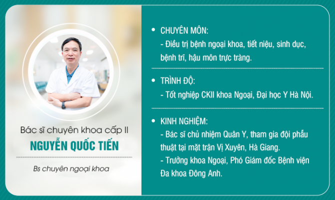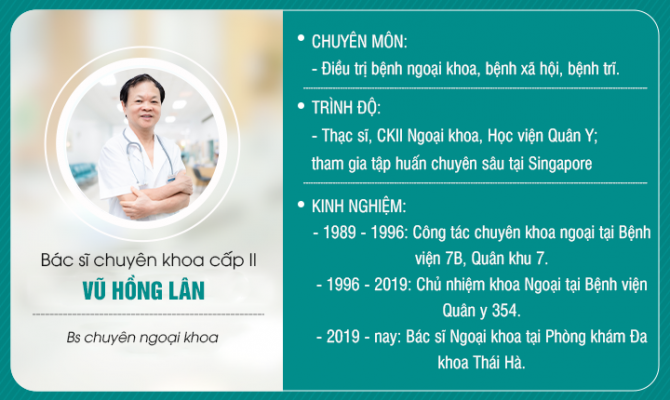 Bác sĩ đã có hơn 30 năm kinh nghiệm công tác tại Bệnh viện Quân Y. Bác đã xuất sắc nhận được bằng khen của Bộ, Sở y tế vì có những cống hiến giúp nâng cao chất lượng điều trị cho bệnh nhân. Bác đã chữa trị nhiều ca trĩ thành công, không có ca trĩ nào có thể làm khó tay nghề của bác.