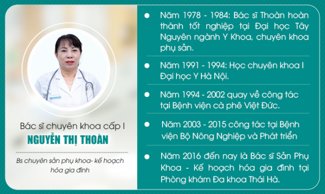 Với gần 40 năm cống hiến không ngừng nghỉ, bác sĩ Nguyễn Thị Thoàn đã ghi dấu ấn sâu đậm trong lòng bệnh nhân bằng sự tận tâm và kiến thức sâu rộng. Tốt nghiệp Đại học Tây Nguyên chuyên ngành Y khoa Phụ sản (1978-1984), sau đó hoàn thành chương trình Chuyên khoa I tại Đại học Y Hà Nội (1991-1994), bác sĩ Thoàn từng công tác tại nhiều bệnh viện lớn, tiêu biểu là Bệnh viện Cà phê Việt Đức và Bệnh viện Bộ Nông Nghiệp và Phát triển Nông thôn. Hiện nay, bà tiếp tục cống hiến tại Phòng khám Đa khoa Thái Hà với vai trò Bác sĩ Sản Phụ khoa, mang lại sự an tâm tuyệt đối cho hàng ngàn phụ nữ.